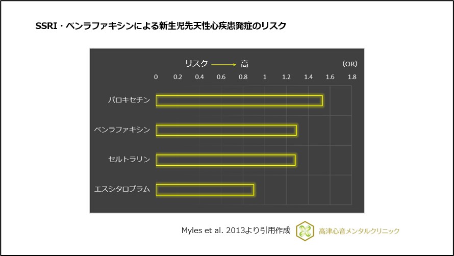 中でも、先天性奇形、先生性心疾患のリスクはパロキセチンでリスクが高く、可能な限りパロキセチンの使用を控えることが望ましいとされています25)、26)、(図20)。
