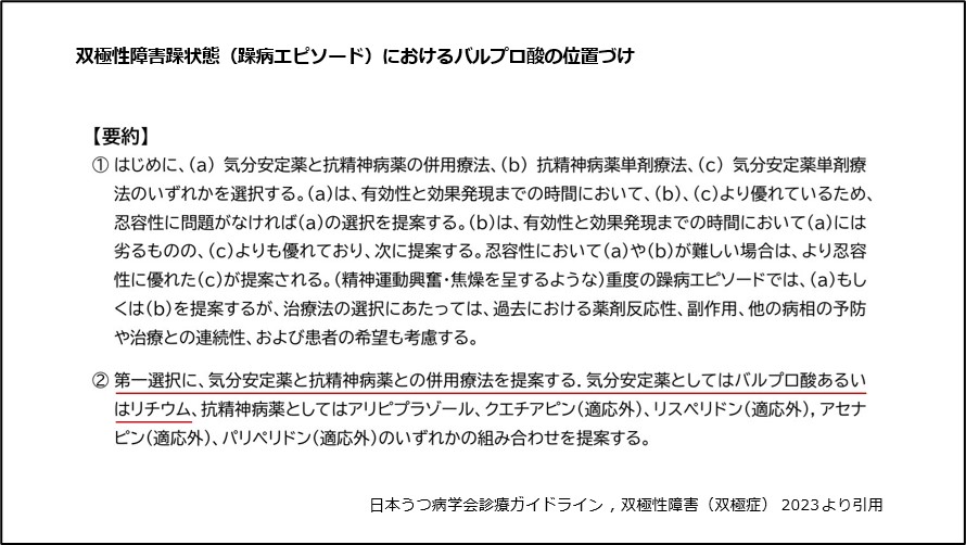 そのため、片頭痛やてんかんなどの併存がある場合は選択肢となりますが、炭酸リチウムが使用できる場合は、認知機能保護作用を有する炭酸リチウムが選択されます。