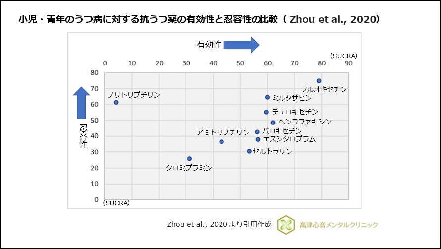 図1 小児・青年のうつ病に対する抗うつ薬の有効性と忍容性の比較
