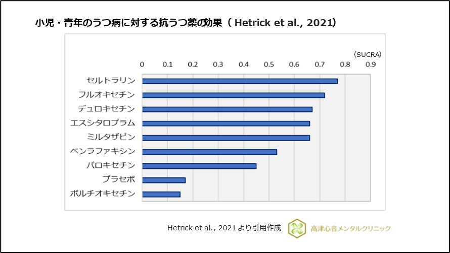 2021年にHetrick SEらは新たに小児・成人に対する抗うつ薬の効果の解析を行い、セルトラリン(ジェイゾロフト)、デュロキセチン(サインバルタ)、フルオキセチン、エスシタロプラムがやや優勢であったことを報告しています。